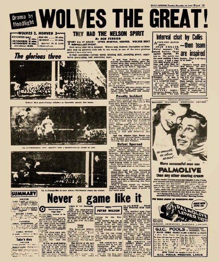 Aquele era também um momento especial na história dos Wolves. Comandados por Stan Cullis, centre half de sucesso no clube entre os anos de 1934 e 1947, os lobos haviam vencido a FA Cup de 1949 e acabavam de alcançar a glória máxima. Em 1953-54, conquistaram o título da primeira divisão inglesa pela primeira vez em sua história. Tal era um marco acima de qualquer suspeita, sobretudo tendo em vista que o clube fora um dos fundadores da liga, em 1888.