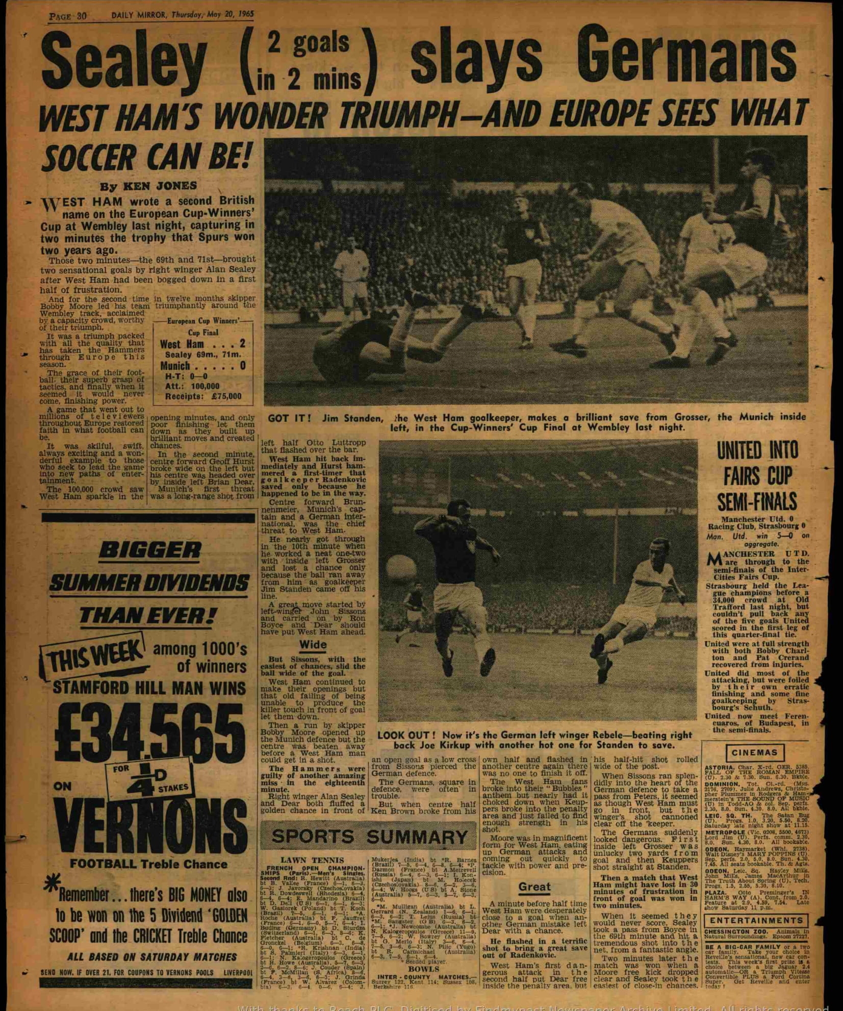 O fato é que aquela final teria nome e sobrenome: Alan Sealey. “Sealey (dois gols em dois minutos) mata os alemães, triunfo dos sonhos do West Ham — A Europa vê o que o futebol pode ser”, exaltou o Daily Mirror no dia seguinte à final. De fato, a manchete reproduziu com exatidão o que se viu. Além de uma exibição de alta qualidade técnica dos londrinos, Sealey acabou sendo o responsável por dois tentos, um aos 25 e outro aos 27 minutos da etapa final da decisão.